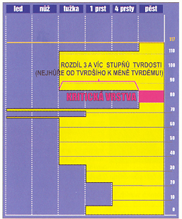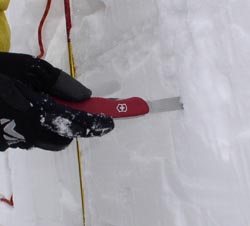 Tento test se používá ke zjištění soudržnosti jednotlivých vrstev a rozdílů mezi nimi. Dá se považovat za jeden z nejprůkaznějších testů zjištění stability svahu a současně i nejjednodušší. Tento test se provádí při práci lavinových preventistů jako prioritní na prvním místě. Měli bychom pamatovat, aby stěna sněhu, na níž test provádíme, byla pokud možno ve stínu (jelikož v 90% spojujeme s klouzavým blokem, není to vždy možné). Vodorovnými čarami se pak zvýrazní jednotlivé vrstvy sněhového profilu, v nichž rozeznáme odlišné tvrdosti sněhu, jak je uvedeno v tabulce. Podstatné jsou pro nás zejména rozhraní mezi jednotlivými vrstvami. Pokud zjistíte, že mezi dvěma sousedními vrstvami je rozdíl více jak dvou stupňů (viz. tab. níže), znamená to již velmi zvýšené potenciální nebezpečí vzniku laviny. Opět zde hrají ovšem roli ještě další faktory, které můžeme zohlednit, jak si ukážeme dále. Test se provádí tím způsobem, že se snažíme vnořit do sněhu různé předměty, které jsou charakteristické pro každý stupeň tvrdosti vrstvy.