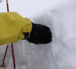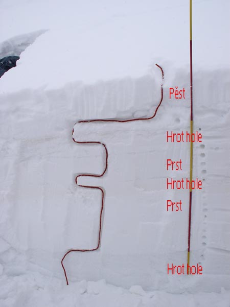 Snažil jsem se neohřívat si svoji zatuchlou polívčičku, ale začalo pršet, a nikam se nejede-Ach jóó! Tak tada: Tyhle výkopové práce bych měl dělat během výstupu vždy, když je důvodné podezření, že přecházím na místa, kde se sněhová pokrývka vytvářela jinak. Tedy na jinak orientovaný svah, v jiné výšce, v jiné konfiguraci terénu...To znamená vykopat lopatkami docela dost kubíků sněhu. Ve dvou, třech lidech? Udělám to? Udělají to? To neznamená, že je to blbost! Určitě ne, ale je to použitelné pro dvojce, čtveřice na cestách?