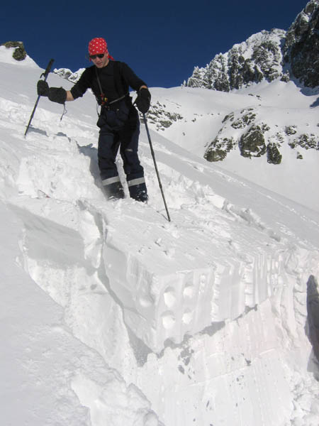 Teď upřímnost na stůl, těch pár vzácných oddílů, co ještě dělají klasické oddílové horoškoly, kolik dní se při horoškole věnuje tomu rochnění ve sněhu ve vztahu k poznání lavinového nebezpečí? Většinou je to 1 týden na horách, a z toho 1 den, že jo. To je na draka. K ničemu. (Nikomu nespílám, v klidu, u nás v oddíle je to stejně bídné...) V drtivé většině probíhá takto: Takže dopoledne nástup před chatou Brnčálka, jdeme támhle pod rezervoár vody na svah, přes poledne tam kopeme lopatama efektní kvádr jak na stavbu Cheopsovy pyramidy, no tady nahoře je to měkké, že jo (no bodejť, vždyť včera sněžilo), jo tady dole je trošíčku tvrdší (aby ne, tlak stlačuje), tak teď do toho hopsneme, křus, nějak jsme to tak napůl rozdupli, koukáme na tu neforemnou kuču, co tam teď leží, no a HS hlasí že je 2. - 3.stupeň nebezpečí. Hm, tak kam zítra půjdeme? Nóóó, asi teda na ty Baranie rohy, co jiného... Zatím uplyne zbytek dne, noc, a další den za úplně třeba jiných podmínek vyrazíme na ty Baranie, kde je úplně jiný svah.