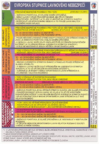 1. nízké nebezpečí - 1/3 zimy, minimální ohrožení, dobře zpevněná sněhová pokrývka. Sesuvy lavin hrozí jen při zvýšeném dodatečném zatížení na velmi exponovaných svazích. Spontánní pohyby sněhu nepřesahují kategorii splazů.