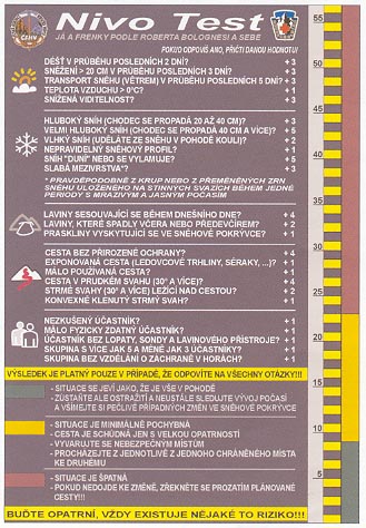 Nivo test je založen na zodpovězení si 26 přesně cílených otázek, které nezohledňují lavinové nebezpečí či jiné informace poskytnuté cizí osobou. To je ovšem vyváženo nezbytností vaší zvýšené schopnosti pozorovat a vyhodnocovat situace ve vašem okolí. Opět tedy narážíme na problém „Znalost – Zkušenost – Odpovědnost“.