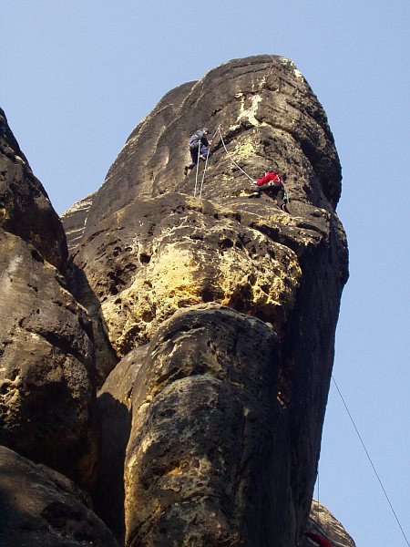 Již v posledním díle jsem zmínil i záhadné zmizení cesty Falka Heinickeho. I to se tedy může stát. Další záhadou mohou někdy být i počty kruhů. Zvláště pak těch dodatečně přidaných, v textu popsaných "nR". Zrovna na cestě Südostwand na Hafersackkrone v Brandu jsme si mohli oči vykoukat, abychom našli druhý dodatečně přidaný kruh, až jsme zjistili, že byl asi opět dodatečně vytlučen. Podobně se nemůžu opakovaně dohledat prvního přidaného kruhu na cestě Eiszeit na Dreifingerturm na Schrammsteinech. Chce to přistupovat k popisům cest s rezervou.