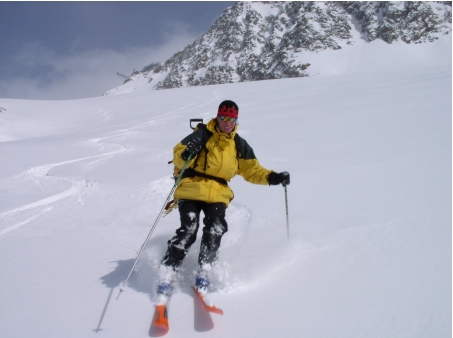 Při plánování prvních společných skialpových dobrodružství je nutné zajistit několik důležitých věcí. V první řadě je to dokonalé počasí. Musí být azuro, možný je sem tam nějaký ten mráček nejlépe ve tvaru něčeho roztomilého. Nedopusť, aby dívce bylo zima. Pro tuto eventualitu jsi to Ty, kdo má v baťohu nějaký ten svetřík navíc. Druhou, neméně podstatnou podmínkou úspěšného začátku je vhodný poměr výstupu ku sjezdu. Není vhodné, aby se dívka hned na úvod dozvěděla, jak to doopravdy je - půl dne do kopce, patnáct až dvacet minut z kopce. Nejlepší je, necháte-li se pokud možno co nejvýše vytáhnout lanovkou, poté absolvujete nějaký ten kratší výstup nezbytný k tomu, aby se vaší aktivitě dalo říkat skialpinismus a pak hurá dolů až do údolí. Pro výcvik mé dívky se pro letošní sezonu stalo naším hřištěm zejména okolí nejvyšší hory Tyrolska Wildspitze.