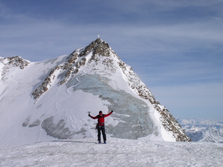 fotky jsou pro ni důležité, aby mohla kamarádkám ukazovat, jaká je drsňačka. /V pozadí západní - dost zledovatělý svah Wildspitze - tj. normální cesta/