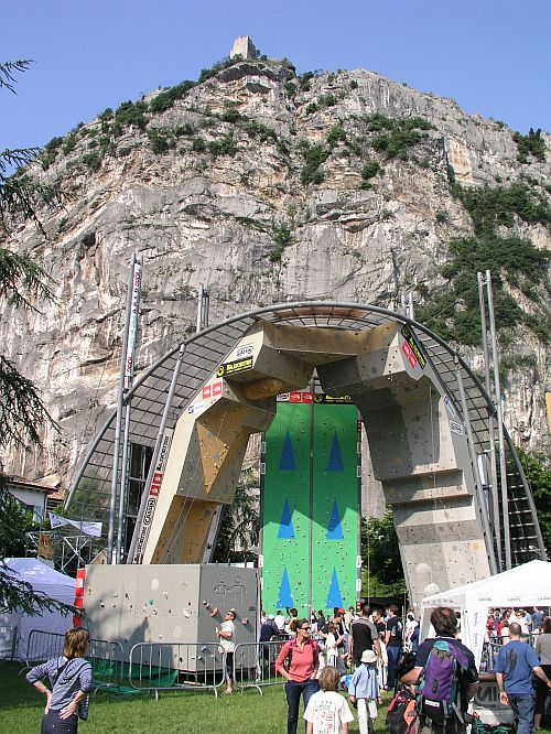 Slavná stěna v Arcu - v béžových a šedých převisech se lezla obtížnost, na zelené ploše rychlost, na šedých stěnách v popředí se lezla jedna z cest (traverz) v rámci závodu Kid´s Rock