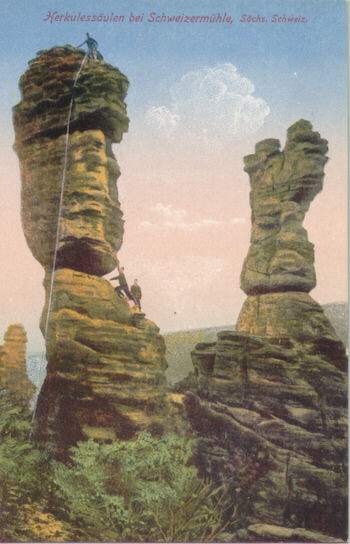 Začnem sice tím větším, ale lezecky méně hodnotným Grosse Herkulessäule. Jediná cesta, která trochu stojí za námahu, je „Alter Weg V“, hvězdičková, ale nejištěná 100 let stará klasika! Autor pan Rudolf Nake s druhy. Cesta nic moc, ale vršek je bomba!