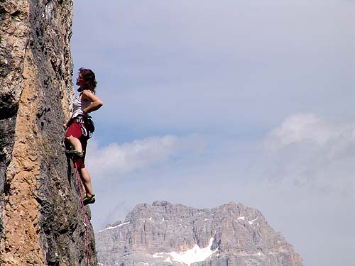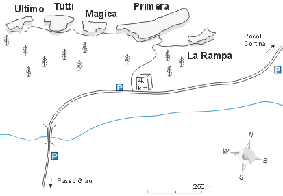 známého turistického střediska Cortina d Ampezzo. Jedná se o obnažený vápencový skalní val v údolí nad cestou do sedla Giau. Nachází se v nadmořské výšce 1800m a najdete zde více než 70 cest od 6a do 8a+. Oblast má dvě hlavní části Alti vyšší a Bassi nižší. Nejdříve vám přiblížím oblast Crepe de Oucera Alti, která je poněkud zajímavější a jsou zde obtížnější cesty. Oblast Bassi je vhodná pro pohodovější lezení poněvadž lezení se zde odehrává v převážně kolmých stěnách a bude o ní řeč v následujícím pokračování.
