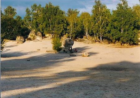 Nevěřícně stojíme odpoledne na nádraží ve Fontáči. Se skvělým zlepšovákem na stopování (můžete vidět na fotce) a příjemnou paní dorážíme do oblasti Bas Cuvier. Oblast je situována hned u cesty v borovicobukovém lese. Nedočkavé ručičky zkoušejí zdejší nenapodobitelný materiál. Strukturou připomíná hroší kůži nebo želvu. Zbytek dne strávíme hledáním bivaku. To celkem nebyl problém a po znavujícím dni konečně uléháme pod 8b.