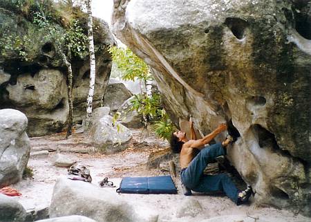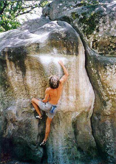 Ráno nás probouzí vůně maglajzu a nějací Italové. Je žízeň. S naší perfektní znalostí jazyků (a jednou francouzskou větou: Vous voulez kuse avec Moi? He he dík Skobovi a Ríšovi!)  zjišťujeme že vodu jen tak neseženeme:) No ale pít se musí!!! Hanys nakonec vyžebrá 4 litry od nějakého vietnamce v luxusní restauraci Le Grant Veneur. Později zjistíme, že hned vedle restaurace, na druhé straně cesty, jsou čtyři kohoutky s pitnou vodou. Zde se dá taky celkem dodržovat hygiena (správní lezci ví, o čem je řeč:)). Sice cestou pro vodu nás vždy lákala místní prostitutka:) No ale my jsme tady od lezení přeci! No a to je tady, kde bouldering vznikl, velice krásné, někdy silové jindy zase technické! Většina boulderů tak do klasifikace 6a jsou technické neboli úplně bez noh. Při přelézání těchto boulderů si potrápí hlavu i ten nejtechničtější fajnšmejkr. Často jsme tento problém nemohli vyřešit. Ale do dne se vždycky objevil nějaký zdejší technicky vyspělý lezec a poradil. Tak to tady chodí. Silové bouldery byly pro nás příjemně vysoce hodnoceny. Kdo alespoň trochu má nabušenou sílu z bouldrovky, tak si zde taky smlsne. Tam lišta, tam patička, tam daleko spoďáček, tam skok do kapsy. Mňam.