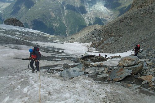 Cestou dolů potkáváme několik zajímavých případů v čele s typem s vyzutou mačkou, který na upozornění, že mu padá, říká, že to ví - už v BC mu vypadli prej nějaký šroubky. U Vallotu se zas potuluje sám po ledovci Slovák a ptá se nás jestli jde dolů z Mont Blanku někam slanit a přitom ukazuje na Midi-kam nakonec slanil by nás opravdu zajímalo. Protože chceme sejít dolů ještě dnes, máme nakvap, ale po skále od chaty to moc rychle nejde, člověk je přeci jen trochu unavený a musí neustále dávat pozor. Pod kuloárem jsme svědky asi nejimpresivnější scény celé expedice. Dolu si to skálou sviští dobře 70litrák baťoh, metá děsný kotrmelce a při každém nárazu o skálu z něj něco vylítne. Je nám jasný, že takhle podobně by letěl i člověk… Franta lezec z toho byl asi trošku špatnej, tim spíš že bágl skončil až dole na ledovci a lézt pro něj do kuloáru je dobrý možná tak v obrněnym tanku.