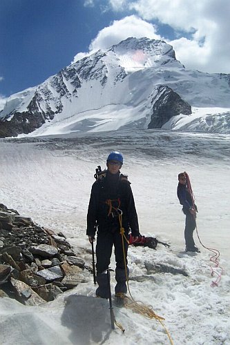 video - rozsekaní mamuťáci na Dom Hutte, 9MB)Trochu sondujeme podmínky výstupu a přesouváme se o 20 minut dále směrem k ledovci rozpačití, zda jsme něco nepodcenili, je to naše první čtyřka a tudíž nevíme jak to s těma mamutama chodí.