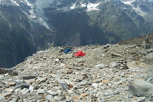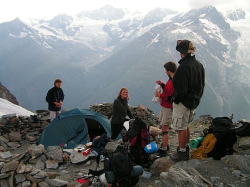 Start: obec Randa cca 10km před Zermattem, značení hned od vlakové zastávky. Přes všechny vegetační pásy kolem Europahutte a magistrály na Monte Rosu. Nad Europa Hutte začínají fixy, všechno v cajku, stačí dávat pozor. Jakmile se vyhoupnete ze skály spatříte u ledovce a vodopádů Dom Hutte (2940m)-bezva polívka s extrémně tenkými chlebíky za 7E, hustej správce-bejvalej lezec se kterým spadl vrtulník a už nikam neleze a má to celkem na háku. 20 minut nad chatou asi 7 placů na stany mezi kamením. Bezva klídek, výhledy na Matterhorn a Weisshorn, okolo 2ráno průvod světýlek.