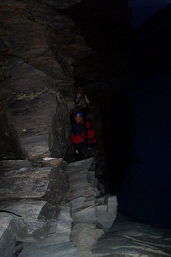 Pod Festijochem ještě ve tmě nám svítí do očí čelovkou Švýcar Jerry, který vyšel v 10 večer z Randy a Dom chtěl dát s kámošem na jeden zátah. Kámoš ale asi moc v týdnu pracoval a je úplně rozsekanej, takže Jerry jde s náma jako poslední vagon metra. Trošku nás udivuje hned na skále, kde si nesundavá mačky, což si vysvětlujeme jeho movitostí a na oplátku ho udivujeme tím, že nejvyšší vrchol Švýcar je naše první čtyřtisícovka - to aby se začal malinko bát. Jinak výšvih na Festijoch je třeba brát s respektem a to hlavně ve tmě, v nejvyšším bodě je přeci jen ta cedulka se třema křížkama.