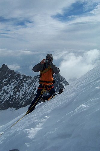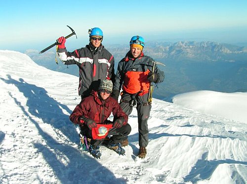 Jediný co za to stálo, jsou fotky a pocit že z fyzického hlediska na tom nejsme nejhůř, což dodalo další motivaci hlavně Jendovi, kterého Dom úplně rozsekal. Asi teda doporučuji všem, kteří se na Mont Blanka chtěji vypravit bez zkušeností, ať si daji nějakou jinou čtyřku. Dom je sice záhul, ale dá se tam zabít mnohem hůř než na Blanku a aspoň si tam člověk vyzkouší na co fyzicky má nebo nemá. Jet s cestovkou, která naváže 5 sekretářek do družstva a vypustí je na hřeben je podle mě totální kravina, tím spíš, že takhle člověk neušetří ani kačku. O pocitech po dobytí vrcholu ani nemluvě…