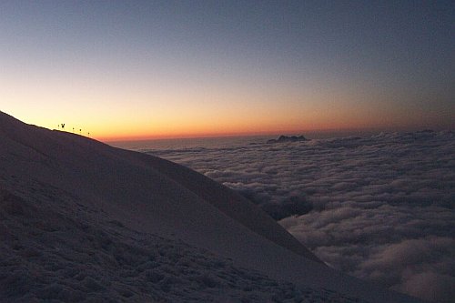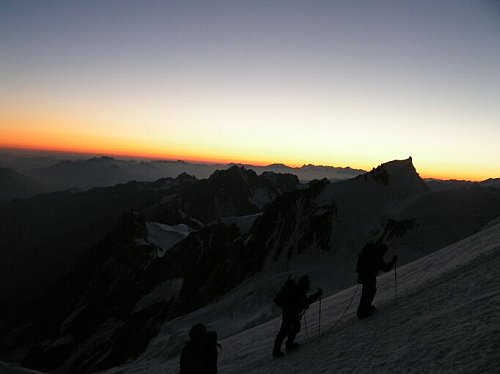 Neboť jsme zřejmě dobře aklimatizovaní spí se nám v noci suprově. Dokonce tak skvěle, že se nám nechce vstávat v určený čas do zimy, která venku při bezmračné obloze panuje. Místo po druhé tak vyrážíme těsně před čtvrtou, což nás řadí někam na konec davu lidí převážně česky mluvícího. To je věc nemilá, neboť lidi, kteří si předtím jednou stoupli na mačky na Grand Paradisu, jsou navázáni na lano v počtu 5-15 a cepín drží opačně, pakliže ho však vůbec mají, jsou doslova eskadrou smrti. Tím spíše když jich několik ještě než dojdou k Vallotu zvrací a padá vysílením. Nic tak hrozného jako vylézt na Gouter ve frontě delší než na pražské MHD kupony jsem ještě nezažil. Pocit beznaděje řeší až svítání, které je jedno z mála věcí, jež stojí za to na Mont Blancu zažít a jakžtakž vyvažuje naše utrpení uprostřed davové mánie. (