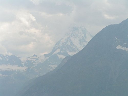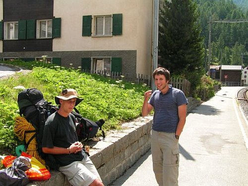 Tlapík, jsa punkovým cestovatelem, na nás to ráno čekal u stanice v Randě a dobrou hodinku výstupu úmorným vedrem po alpských lukách a lesích nás tak mohl zahlcovat svými poznatky z autoštopu. Jak je naším dobrým zvykem, na zádech jsme nesli úplně všechno, ba i něco navíc, a tak jakmile se louka změnila v les, zakopali jsme vše, co jsme po následující dva dny nemohli potřebovat, pod větve u cesty a snížili tak 25kg našich batohů na přijatelnou hodnotu pro dobrých 2000 metrů výškových lopocení se všemi vegetačními pásy až k chatě Dom Hutte. Dole v Randě tabulka říká 4,5hodiny cesty, nám to trvalo dobrých 6 hodin, ale nijak zvlášť jsme neběželi, spíš jsme se kochali florou, faunou a Matterhornem,