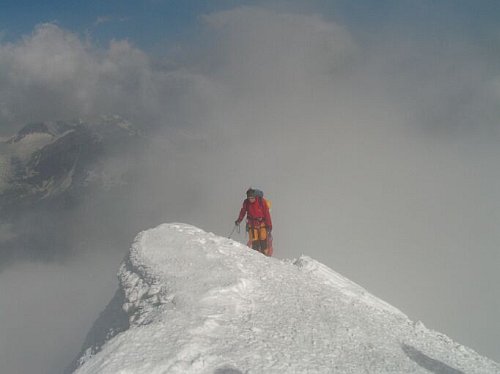 Ale protože time je podle něj stále good a ani odtrhová trhlina a závěrečný hřebínek nás nezastaví, spočinou hroty našich maček v 9:30 ve výšce 4545m. Jsme zde skoro sami, jen dvě pěkné horolezkyně jódlují od kříže do oblak.