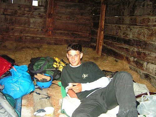 video - satisfakce po dobytí vrcholu - stojí za to slyšet, jak Jenda vypráví jak na sračky jest 5MB) Dolů kopec spíše sbíháme než scházíme, jen Jerryho úplně sešmíkává pohled na dvojici zamilovaných Čechů v šusťákových soupravách AHEAD. Pod Lenšpicí pak vyndavá z báglu vajíčka a šunku, která je nám odměnou za naši taxislužbu. (DOM.jpg )jenže ke stanům stále daleko, musíme znovu přes Festijoch, což je práce nemilá a dole na ledovci se mi už nohy motají řádně. Ve stanu usínám okolo 13:00, abych zaspal déšť a spolu v chlapci v pět zabalil proviant a spustil se dolů do údolí. Zásoby nacházíme těsně před setměním vcelku v pořádku, jen mi nějaká fauna sežrala všechny sušenky, mimo ocelové jesenky, kterou se v zápětí odměňuji. Spát jdeme do seníku po dlouhých 19 hodinách akce.