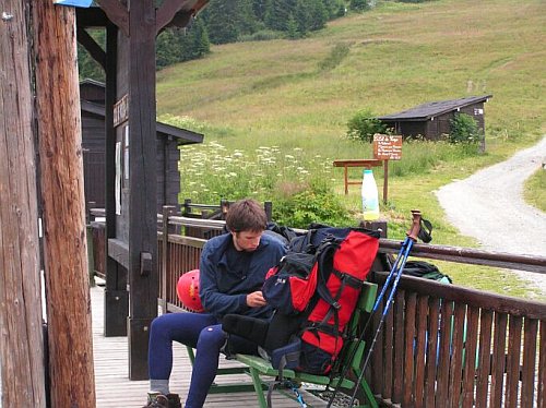 který se objeví poprvé těsně pod Europa Hutte. Krátce poté pak začíná kletrštajg, který je zpestřením jinak úmorné cesty. První Franta horal, který nás dobíhá zezadu říká, že chata je plná, což nám ale nemůže vadit, protože na ní stejně nemáme peníze. Pivkem za odměnu na chatě ale nepohrdáme a řadíme se tak do klubka úplně rozsekanejch alpinistů v oblečení Mammut, kteří se povalují všude v okolí chaty i v chatě samotné. (