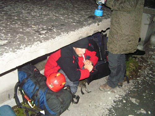 Cesta dál vede po kolejích, ale je zataženo a předpověď vysondovaná v domě předpovědi počasí v Chamomix nějak nevychází. U betonové pevnosti Arot začíná pršet, takže se nám dál do oblak nechce, s čelovkou na hlavě je totiž vidět tak na 5 kroků. Volíme tedy nouzový bivak u obrovských ocelových vrat, do půlnoci klepeme z lenosti kosu, ale nakonec abdikujeme a vlézáme pod vlákna našich spacáků.
