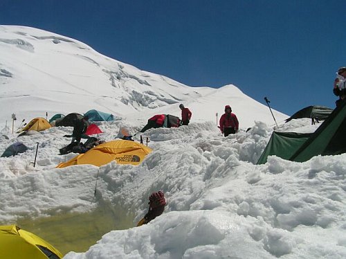 Od Vallotu to nahoru doslova vyběhneme už každý sám, protože občas se tu dá na rozdíl od Domu i někam spadnout - mimo to nám desetičlenné eskadry smrti balancující na hřebeni s pocitem, že když pojedou dolů všichni, lépe se zastaví, dodávají sílu nadlidskou. Na vrcholu jsme v sedm ráno, což je výstupový čas okolo 3,5h z BC. Klídku si tu člověk moc neužije, zato nacházíme u vrcholové tyče či co to je, vlaječku Baníku. Je to opravdu český kopec. (