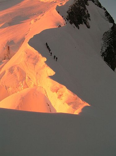 Druhý den : na chatě se vstává ve 2:00, takže je třeba spěchat. Za bivakem stoupáme na Dom du Gouter občas i přes trhliny, z Gouteru dolů na ref. Vallot (nouzová plechovka) a pak už nástup na hřeben, který se chodí povětšinou zprava, takže líp se padá do Itálie. V případě ledu a větru to nemusí být nic lehkého, my měli štěstí. Na vrchol se bez obav vejde celej vlak plus Karosa. Padat je kam celkem často.
