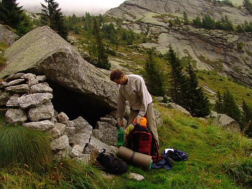 Pak jsme už jen Jirkas a já dorazili do Val di Mello. Zde nejprve skalky dole - moc pěkná žula, zajistěná, docela tvrdá klasifikace. V dešti jsme zapytlili jednu 7a pod převisem a pak pršet přestalo, tak jsme zkoušeli v plotnách nějaký 6a a 6b a nakonec jedno 6c+. Vše pěkně zajištěné a bezvadný materiál a impozantní prostředí. Jirka si to nafotil a namaloval a dává info na Lezce.