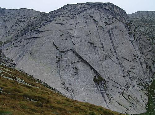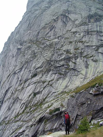 Lana jsme tam nechali na druhý den, ale to bylo nejisté počasí, silně zataženo, z dálky zněla bouře a nezdálo se nám to jištění, nebyly jasný další štandy, tak jsme se rozhodli to zabalit. Ještě jsme si s horním lanem vyzkoušeli znovu úseky k nejtu a řekli si, že si příště snad vemem nádobí na budování nejtů a že to případně trochu dojistíme, kdyby se nám to nahoře nezdálo.  V dolině pod Qualidem jsme byli úplně sami (krom ovcí, kamzíků a svištů), je to hodně odlehlý a myslím, že se to teda moc neleze. Aspoň ta cesta, co jsme zkoušeli, autoři prý neznámí a nějaké stopy po frekventovaných přelezech zjevně chyběly. Vpravo od ní jsme prozkoumali první rezavé nýty dvou vynýtovaných linií za 7a (6b+ až 6c povinné), ty byly slušně dostupné, skoro k nim jsme dolezli v sandálích. A kromě materiální přípravy musíme o těch stěnách a cestách zjistit víc. Snad poradí Zoban, dělal na Qualido cestu.