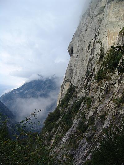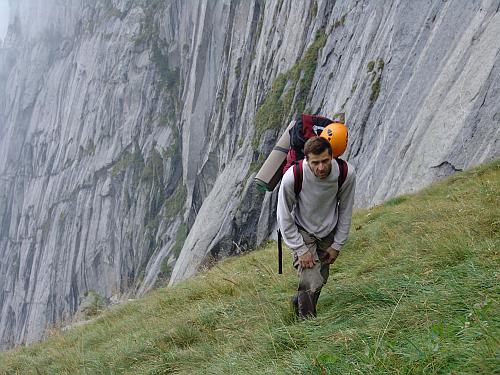 Qualido vypadá hrozivě a obtížně jsme se tam orientovali. Poznali jsme jen ty klasický bigwallový výstupy, ale nenašli jsme nástupy na ty tzv. sportovnější cesty. Vůbec nám nebylo jasné, kudy by mohly vést. Ze stěn visela lana z těch klasik. Ale žádné jasnější linie s nýty, které měly být napravo, jsme neviděli, spíš travnatá pole. Byla ale dost mlha, tak jsme stěnu studovali jen chvílema.