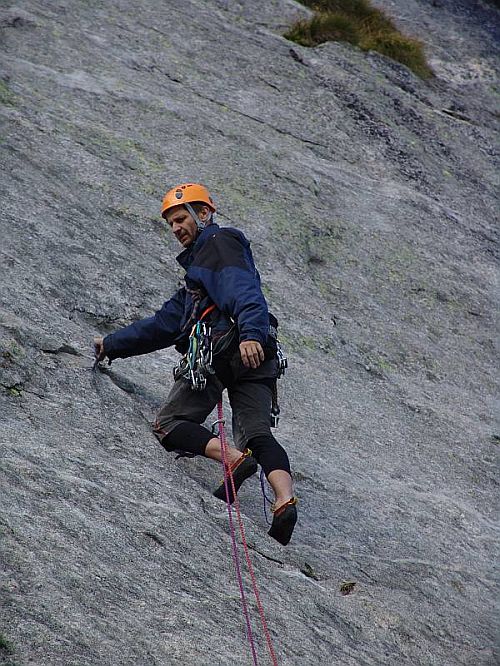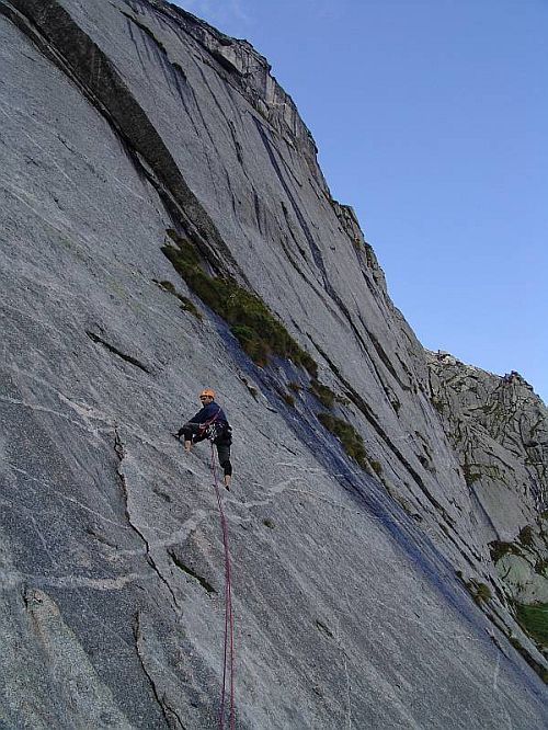 První délka prý za 4b (to je ta na tý fotce, jak jí dal Jirka na Foto dne) byla dost blbě jistěná - celkem tři pofidérní stopery na 50 metrech v žule, která se občas trochu drolila - a přitom plotnový lezení, bych řekl, že místy tak za 5 až 6 UIAA, přes převislý trávy (to jsem jestě nezažil ani v Tatrách: normálně pravou rukou jsem se opatrně držel trsu ostřice jako chytu) dolez ke štandu - tři friendy v mokré spáře. Pak Jiří podél sokolíkového mokrého odstěpu pod převisem, nejdřív se musíš sakra opatrně držet takovýho odštěpu, kterej vypadá, že musí upadnout i s tunou skály sám od sebe. Pak pár metrů traverz pod střechou převisu za lupen, nic moc friend, a pak do lepšího. Tam byl první nejt, takovej pěknej, jako novej, asi ho tam někdo dovrtal. Pak ještě kus v lepším, ale podobná expozice, převísek a kout - což měla bejt nejtěžší místa za těch 6a - a pak přicházela tma. Škoda, to nejtěžší z cesty máme za sebou. Tak se Jiří spustil z čoku k nejtu a z něj jsme slanili necelejch 60 metrů pod stěnu.
