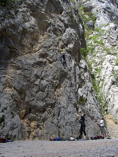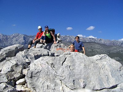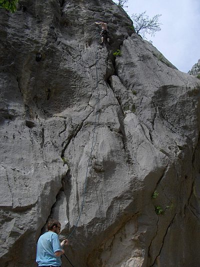 Sestup doporučuju provýst v pevné obuvi a a nejlíp s doprovodem, protože my jsme ještě na hřebeni trošku zakufrovali a po malejch kamínkách, který se s tebou sunuli jsme si to zvesela vyšlapovali v sandálích. Tak jsem se zařekl, že první „bigwall“ a taky poslední. Přelezli jsme poměrně dost delších 5céček, poměrně dost 6áček, pár 6a+ a Pavel onsajtnul 6b. Nicméně co by to bylo za návštěvu Paklenice kdybychom nedali Mosoraški za 5c a Pavel s Jakubem Velebitaški za 6a+. Každopádně o Mosoraški Vám něco řeknu. Nalezli jsme o vosmé ráno a před náma byli jenom Pavel s Honzou a nějaký Litevci, Litevci ale lezli jako šneci a tak je na jednom štandu kámoši předběhli, nám už se to nepodařilo a tak jsme se štand po štandu táhli za nima. Jednak Litevka schodila dva kameny, jeden balvan, kterej se řítil až dolů a jeden menší, kterej mněl to potěšení rozbít mi přilbu. Sice jsem na štandu celkem dobře procvičil anglinu, ale to že kámoši dolezli Mosoraški o půl jedný a my jsme slavnostně zařvali top až vo pěti svědčí o tom, že to byli fakt profíci. Navíc jsme u čtvrtýho štandu uhli do leva namísto u pátýho a lezli jsme tzv. starou variantu, kdy na štand, kterej tam byl bych se nepověsil ani v dvoumetrový výšce. Litevka která lezla přede mnou mi vybrala všechny erární smyce, který tam byly (jinak po bórcích či nejtech ani památka) s tvrzením, že jsou jejich a stála si na svým, takže jsem si vyvedl 30 m dýlku na dvě svoje smyce, který jsem tam tak nějak obtočil kolem kamenů. Fakt skvělej pocit. Kráva. No budiž. Jinak kdo leze vícedýlkový cesty bez přilby tak je magor a měl by si to srovnat v hlavě dřív, než mu poteče mozeček přes ksicht. Já měl cyklistickou, vypadal jsem jak dementní socka, ale asi mi zachránila život, no minimálně otřes mozku s výletem vrtulníkem do nemocnice a doživotní splácení léčení, protože komu by se chtělo platit stovku na den za pořádný pojištění.