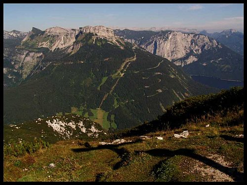 Po “aklimatizaci“ v příjemném městečku Hallstat jsme se přesunuli k první zajištěné cestě. Tou byl výstup na 1975 metrů vysoký Sarstein. Tady jsme přišli o první část ideálů, jednak o Rakousku, díky jejich naprosto mizerně značeným turistickým cestám a druhak o popisu zajištěných cest v průvodci, který je třeba brát s rezervou. Z parkoviště v sedle Potschenpaß, odkud se k Sarsteinu přistupuje, totiž potřebujete k nalezení turistické cesty téměř telepatické schopnosti. Z parkoviště je třeba zamířit k už z dálky viditelnému lomu. V průvodci popisovaná cesta “ve výšce 1250m a mezi 1400 a 1500m několik pasáží zajištěných fixními lany” ve skutečnosti znamená dva úseky s pofiderními lany o celkové délce nepřesahující 20 metrů. Ale což. Vejšlap se solidním převýšením to byl nakonec hezký.