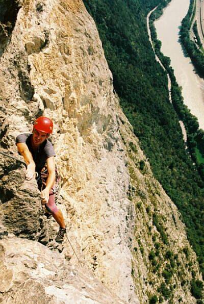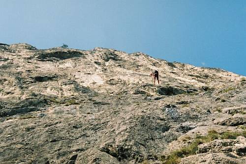 Auckenthaler, tvořené mohutným koutem. Kromě jasné linie láká cesta parádním odjištěním borháky a to i trojkové délky. My však záhy z cesty odbočujeme doprava a po zapytlení nějaké morálové hrůzy (osmimetrové odstupy nýtů v délce za 8- v ne vždy pevném terénu) dáváme parádní osmičkovou cestu