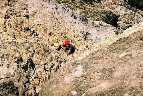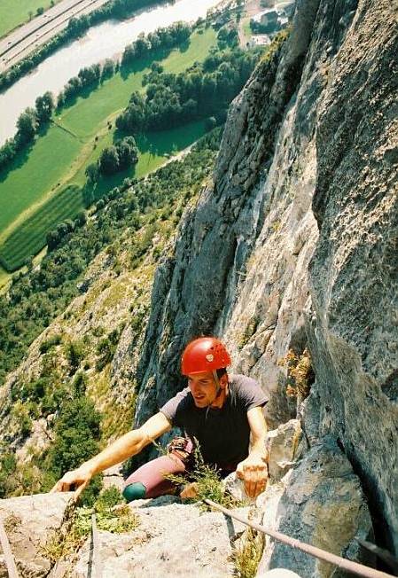 A tak se stalo, že v půl šesté ráno v sobotu 4.září zazvonil budík a hrabali jsme se ze spacáků pod rakouským Martinswandem. Volba vstávat časně byla naprosto správná, neboť v 5.35 začalo pršet. Půlhodinka nadávek v autě a počasí dovoluje udělat snídani a začít balit. A přichází další sprška, tentokrát s hromy a blesky, po níž už jsem asi jediný z naší dvojčlenné výpravy, kdo věří, že dnes ještě vyrazíme. Opak je však pravdou a po deváté nastupuji do stěny, připomínající vodopád, délkou klasifikovanou 6+. Nutno říci, že nástupu do vlastní stěny předcházelo bloudění po travnatých policích, samozřejmě mokrých, kde psychiku sráží frustrující pohled na vesele poskakujícího kamzíka v pasážích, kde by za daných podmínek nebylo na škodu se zajistit. Tak tedy konečně