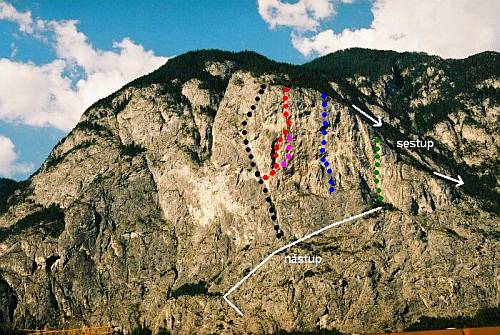 Nejjasnější linie stěny. Odjištěná až překvapivě dobře, což umožňuje lézt rychle a nezdržovat se se zakládáním a to i v místech, kde by to skála umožňovala. Lezli jsme pouze první tři délky, které jsou pro svou oblíbenost poměrně dost oklouzané, předpokládám, že výše to nebude jiné.