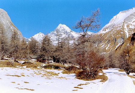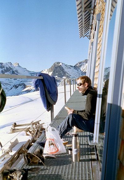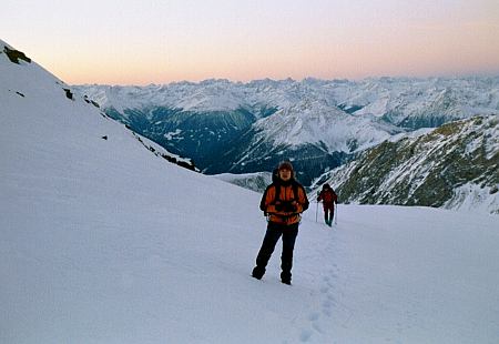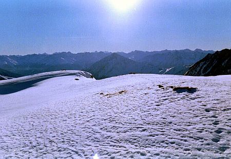 Asi po hodince jsme konečně na slunci, všechno svlékáme, hned je tak o 15° víc. Plážák Jarda jde dokonce do trenýrek, asi čeká na hütte zájezd volejbalistek…syčák. Cesta ubíhá rychle, slunce smaží, sněhu přibývá, panorámata jsou lepčí a lepčí…