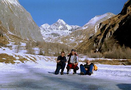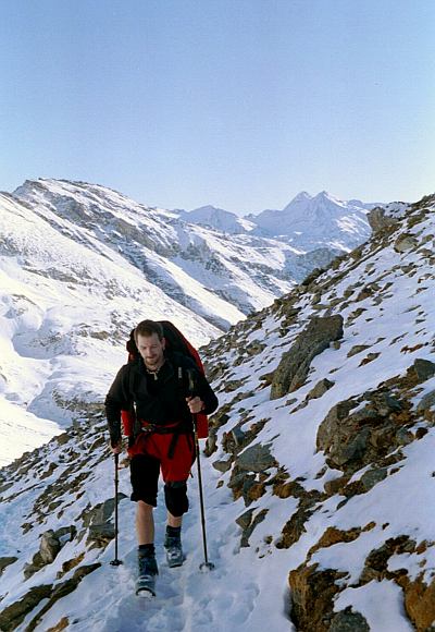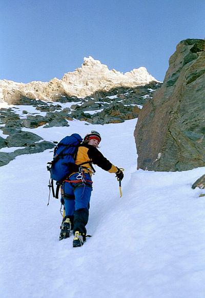 V průvodci udávaný sklon 35° je jako vždy čistě orientační, odhadujeme to na poctivých 50°. Rychle nabíráme expozici, řetízek stop, kterým jsme přišli pod nástup, se zmenšuje. Nálada je dobrá, počasí fantastický, co víc si přát. Po cca dvou hodinách jsme těsně pod sedlem. Tam se terén rapidně mění. Sklon je stejný, jen ten podklad... Lezeme po duté přemrzlé desce, pod kterou je prašan a volné kameny. Celé to parádnicky duní. Ani nedýcháme s představou, že to s námi celé ujede do údolí o tři sta metrů níž… Posledních 50m nám zabralo v tomhle terénu snad hodinu.
