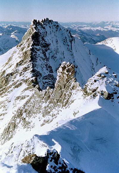 Hřeben vypadá opravdu divoce. Začínáme pikantním slezem pod věžičku, pak následují traverzy v severní stěně nad propastí v labilním prašanu a chrši. Někde je hřeben v krátkém úseku široký tak půl metru a já s očima na vrch hlavy vrávorám mezi severem a jihem a bojuju s rovnováhou a ujíždějícím sněhem pod nohama, abych nejebnul. Dvakrát štandujeme v nýtu stříbrňáku, jinak ve smyčkách.