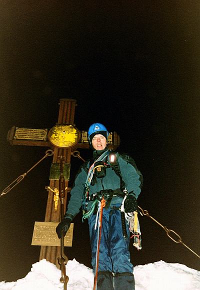 Na každým štandu pozoruju slunce, jak pomalu klesá. Lezeme pomalu, ale v tomhle terénu to snad ani rychleji nejde. Jestli nás chytne tma na hřebenu, strávíme noc ve stoje…musíme to prostě stihnout na vršek. Pak to snad sestoupíme, cestu znám z loňska. Jarda valí, co může. Slunce už zapadlo a začínám na štandu pěkně kosit….jó tak to je ten zimní alpinismus. Mám toho už dost, jak fyzicky, tak psychicky. Jarouš vymotává celou délku, nevidím na něj…co tam dělá tak dlouho…….“nemááám štááánd, musíme souběžněéé!!!“ slyším Jardu z hora….“no to si snad dělá prdel“, pomyslím si…a zruším se. Nohy mám ze štandu úplně dřevěný, čekám, až se trochu napne lano a nastupuju do nepříjemného traverzu. Pod nohama mi ujíždí prašan, zmrzlýma rukama tápu ve sněhu a hledám oporu…cepín do supr spárky, levou ruku po loket do prašanu a vzlínám koutkem nad traverzem…hlavně nejebnout. Hypnotizuju frienda dva metry nade mnou…uuuf, už jsem u něj, držím se ho a čekám, až Jarda popoleze a nebudu mít pod nohama ten dvoumetrovej pytel lana. Začíná se rychle šeřit…..lano se napíná, dokonce i červenej pramen, nojó, to má Jarouš štand!!! Super, valím, co mi zbytek sil stačí, funím jak lokomotiva. Ten pašák to natáhnul skoro až na vršek…dolézám posledních pár metrů a dobírám Jardu k vrcholovému kříži. Máme to za sebou, je skoro tma…podáváme si ruce, cítím obrovskou úlevu, že jsme nahoře. Děláme rychle fotku vrcholovku. Ani nedávám tradiční vrcholový cigárko, musíme rychle dolů z vrcholový hlavy, než se setmí úplně…