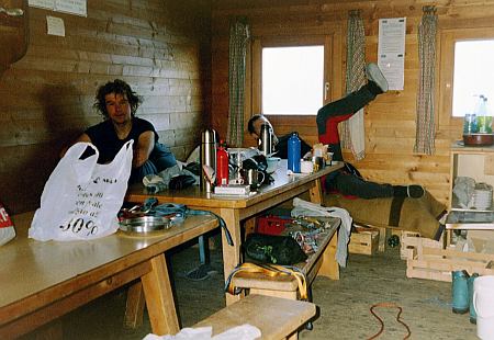 Teplota však rychle klesá a my se jdeme ubytovat do winterraumíku, kde už bydlí partička Maďarů a mladý pár místních. Zimní útulna je fakt útulná…dole je vytápěná společenská místnost, nahoře noclehárna. K večeři máme zapečené jáhle ( nebo jak se to jmenuje ) od Kubíkovo Zůzy. Šéfkuchař Jarda řádně podlejvá, aby se nám to nepřipálilo…takže je z toho fajn kašička…jó Jarda, ať vaří, co vaří, vždycky je z toho kaše! Nic naplat, napápli jsme se parádnicky a v sedm zalehli. Budíka máme na půl čtvrtou, to abychom nebyli přespalí a malátní, jak by řekl Ušák…