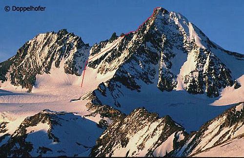 Rozhodujeme se pro kombinovanou tůru – nejprve firnovým žlábkem do sedla mezi Glocknerwand a Glockner a potom trojkovým hřebínkem na vršek, sestup pak normálkou přes Adlersruhe.