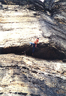 Druhý den po probuzení vás s otevřenou náručí přivítá, pokud jste přijeli Wartburgem, věž Wartburg. Je zkamenělým dokladem toho, jak dlouho už po povrchu zemském tyto spolehlivé vozy jezdí. Už v roce 1893, považte !, jej zdolal dnes zvanou Starou cestou Oscar Schuster. Stojí osamoceně v lese poněkud vysunutá od hlavního masívu, k němuž jinak převážná většina věží přiléhá. Vede zde přes třicet cest od dvojek do osmiček a i když všechny za to nestojí, každý si tu svých pár najde. I morálu zde stačí přiměřeně. Pokud jsme občas měli dojem, že naše nádrže strachu přetékají a chtěli jsme si zalézt, jeli jsme právě sem. Takže Berg Heil!
