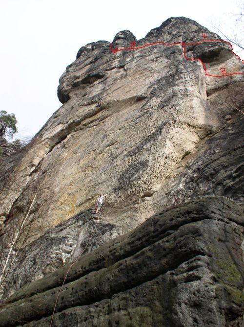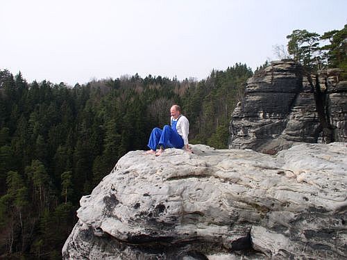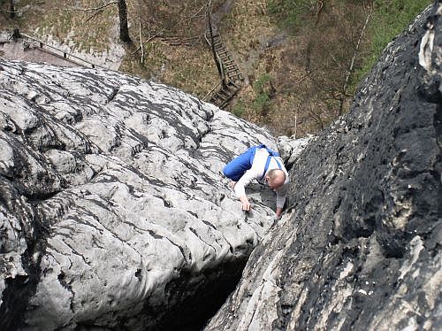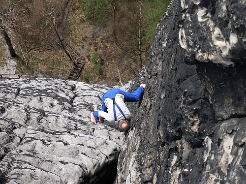 Už jsme začali přemýšlet, jak se dostane dolů a jestli nebude chtít slanit na našem laně. A to jen klasicky, protože sedák neměl a ty naše by určitě nenavlékl. Kdo na Höllenhundovi byl, ví, že ocitnout se na vrcholu bez prostředků není žádná legrace. Slézt z jeho vrcholu bez lana, radši ani nemyslet. Naše obavy byly ale v příštích chvílích degradovány na úroveň řekl bych až turistickou. Než jsme se stihli trochu vzpamatovat, ukončil přízrak mehanik svou vrcholovou seanci i naše dohady a zmizel nám z očí směrem do údolí v místech , kde dolézá Herrenpartie. Naše již trochu uvolněné nervy se znovu propadly do stavu zděšení. Jedno z nejexponovanějších míst v Sasku v téměř osmdesátimetrové výši nad kolmou stěnou jsme až do té chvíle věru nepovažovali za tu ideální sestupovou trasu. Nicméně jsme slaňovali jako o závod, abychom se zespodu stihli podívat, co se v údolní stěně vlastně děje. Když Jehla dorazil dolů, zel Höllenhund prázdnotou a chlapík se pohyboval někde ve vrcholcích vpravo. Zřejmě tedy opět protraverzoval zpět a podle dodatečného zjištění z průvodce zřejmě lezl Südwestwand VIIb. V každém případě to na nás zapůsobilo mocně.