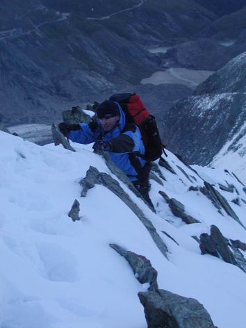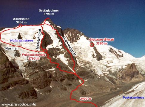 Křivka hřebene Meletzki vychází ze suti na úpatí a stoupá 1100 metrů až k Adlersruhe. Nástup začíná stejně jako normálka, ledovcem Pasterze, kde se dá pěkně zamotat J. Dále směrem na Hofmannův ledovec, ale těsně před nástupem na tento ledovec hřebenem přímo k vrcholu. Hned na začátku hřebenu Meletzkigrat  je místo Früstücksplatz a potom to začíná…