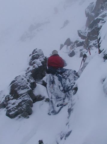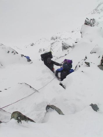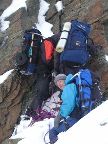 Mačky a cepín byly nutné, o smyčkách ani nemluvě.  Okolo desáté večer, když už jsme věděli, že na chatu na Adlersruhe nedojdeme, jsme se rozhodli pro bivak.