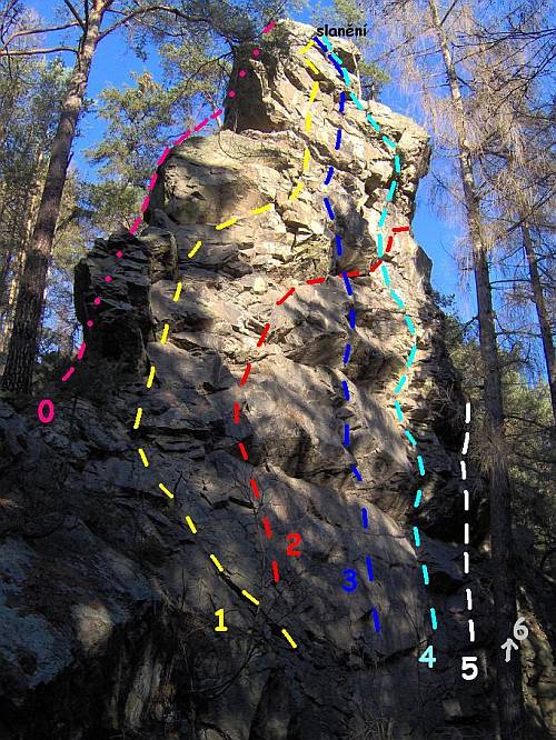 V SZ stěně je několik kratších cest menšího významu. Zajímavější cesty začínají levou hranou údolní stěny. V údolní stěně je ve stěnce asi 3 metry pod křížem umístěn slaňák, který je možné použít pro cesty 2,4 a 5 (tyto cesty považuji za naprostý TOP v oblasti), délka slanění 25 metrů. 0) Nos V+ 2 skoby