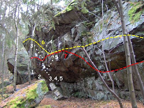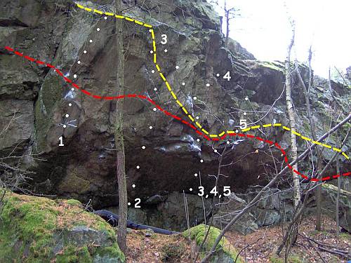 Stěnka s lehčími možnostmi je ve svahu asi 50 metrů doleva.
