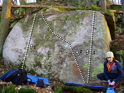 Ja vim ze nijak nezpochybnujes nase vykony (ono take pomalu neni co zpohybnovat), ale znevazujes nase zamilovane kameny. To je toziz ten bouldering: na delce, ehm pardon, na vysce nezalezi. Kolikrat je prave na takovy dvoumetrovy balvan sakra tezky se vyskrabat. Dokonce jeste pred nedavnem razil Petr Resch s Karlem na Petraci tak zvany Perling. Zde nebyly kameny mnohdy vyssi nez pul metru a clovek si k nastupu musel doslovo lehnout. Od tohoto nadejneho smeru se v poslednich dobach uz trochu upustilo, protoze bouldrista - perlista mel notne zasrana zada.