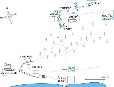 Z Plzně směrem na Nepomuk, v obci Zhůř odbočit na Žinkovy. (6 km) Projet Žinkovy za kostelem podél rybníka směrem k zámečku, 200m před zámečkem nechat auto na parkovišti. Trochu se vrátit a kolem rozlehlého statku (nyní restaurace) po žluté turistické značce mírně do kopce k prvním boulderům v sektoru Bílé kameny. (8 min.)