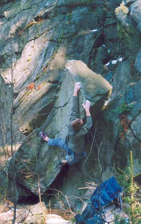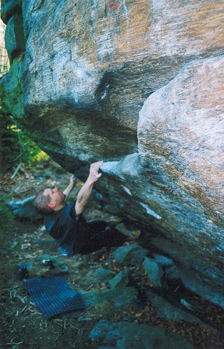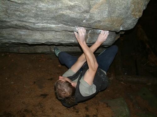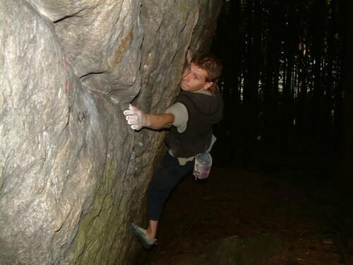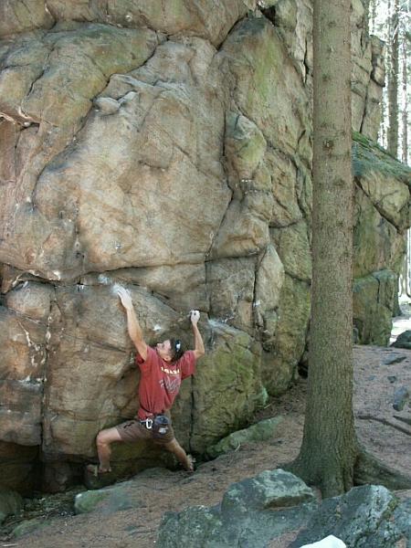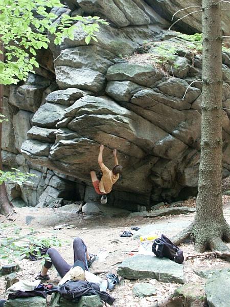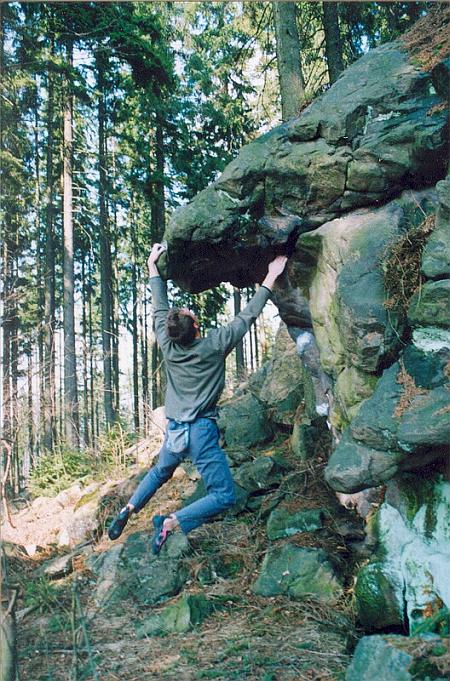 Petr ve spodním boulderu (projekt). Vrchní traverz vede horní spárkou do obíleného sokolíka a opět hořejší spárou 9-/9. Spodní projekt o krapánek těžší, ale zatím nedolezeno takže bez klasifikace.
